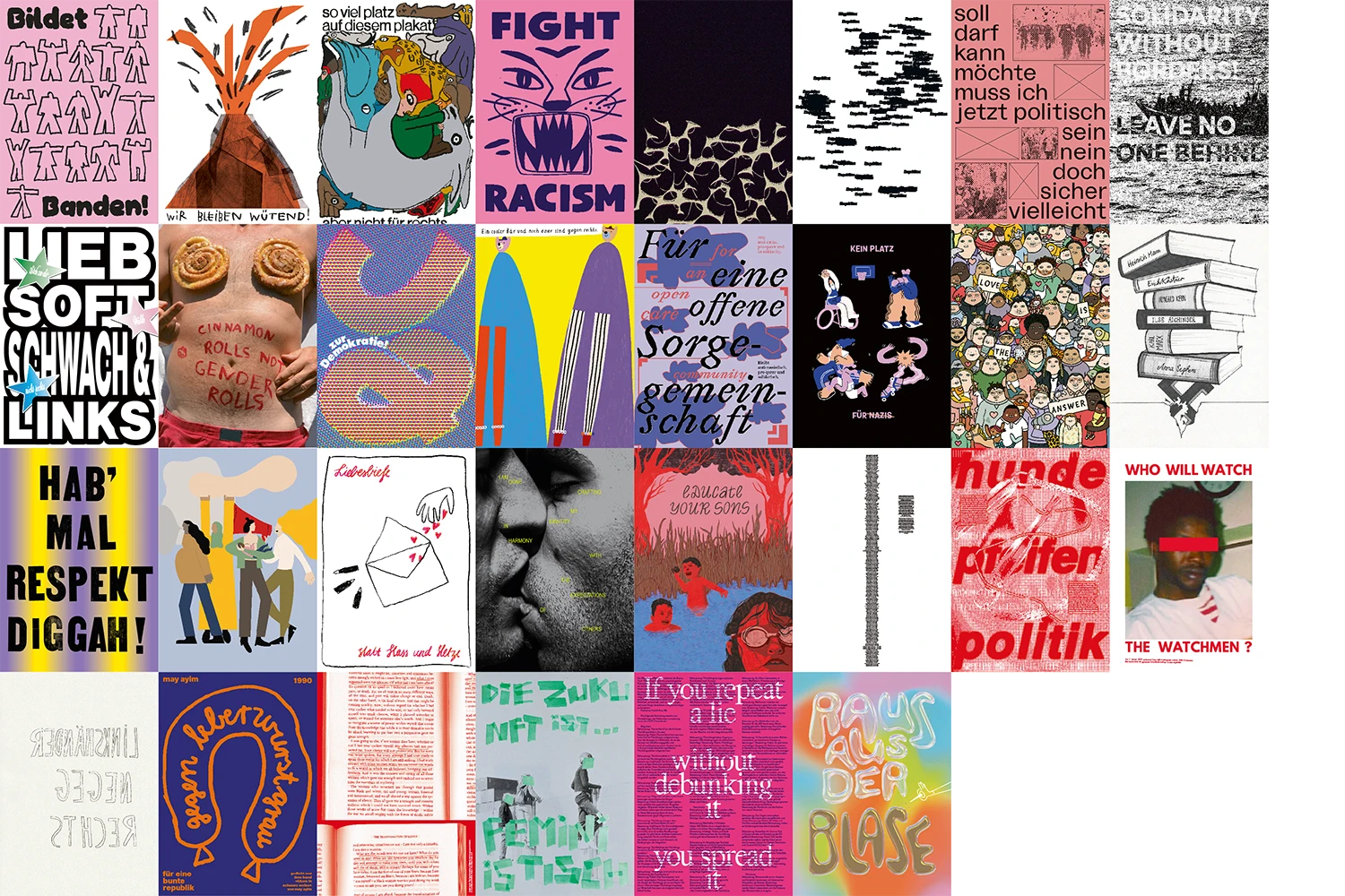 Gestaltet wurden diese 30 Plakate von: Charlotte Riemann, Jill Pastore, Emma Bayer & Jonah Pfadt, Minkjas, Liam, Elia Kim Schick, Robert Sander, Louis, Saige Hippeli & Vincent Völker, Vanessa Göttle, Ossian Osborne, Anna Katharina Jansen, Frida Rempel, Radunkel, Henriette Rietz / Herzette / Wilke von Ketti, Marian, Jugendliche der Stadtteilschule Wilhelmsburg, Pauline Polom, Hannah Blum, Marco Gurrieri, Antonia Rib, Mira Alina, Sina Gösele, Ipke F. Cornils, Martin Gensheimer, Zweifel, Lola Behrens, Studio RoryWitt, Lea Herzfeld